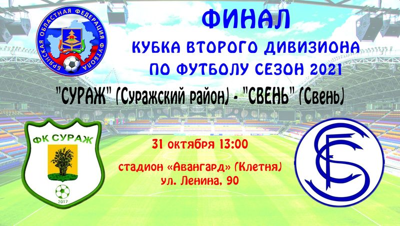 Финальный матч Кубка второго дивизиона между командами "Сураж" (Суражский район) и "Свень" (Свень) пройдёт 31 октября 2021 года на стадионе "Авангард" в Клетне.