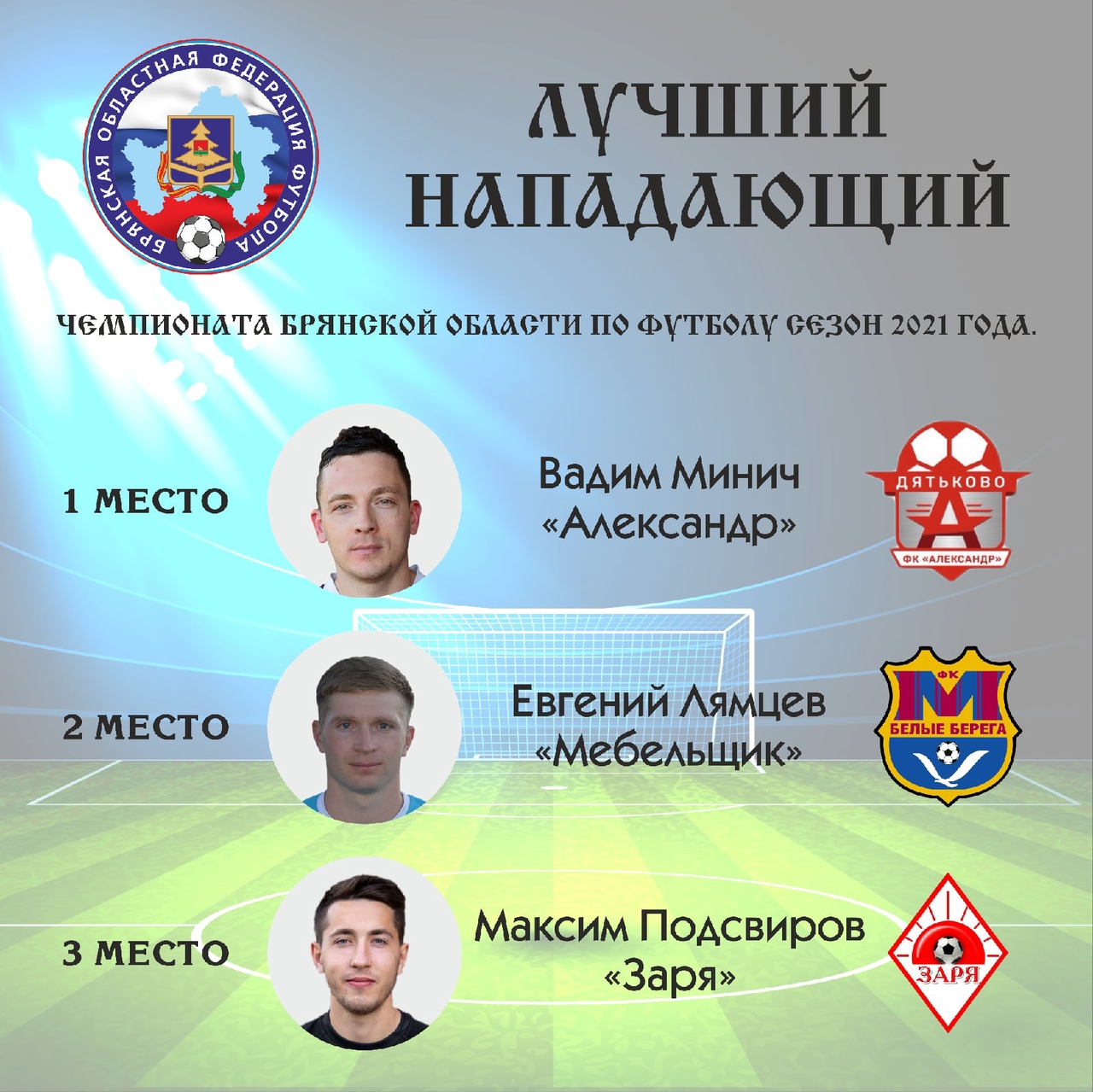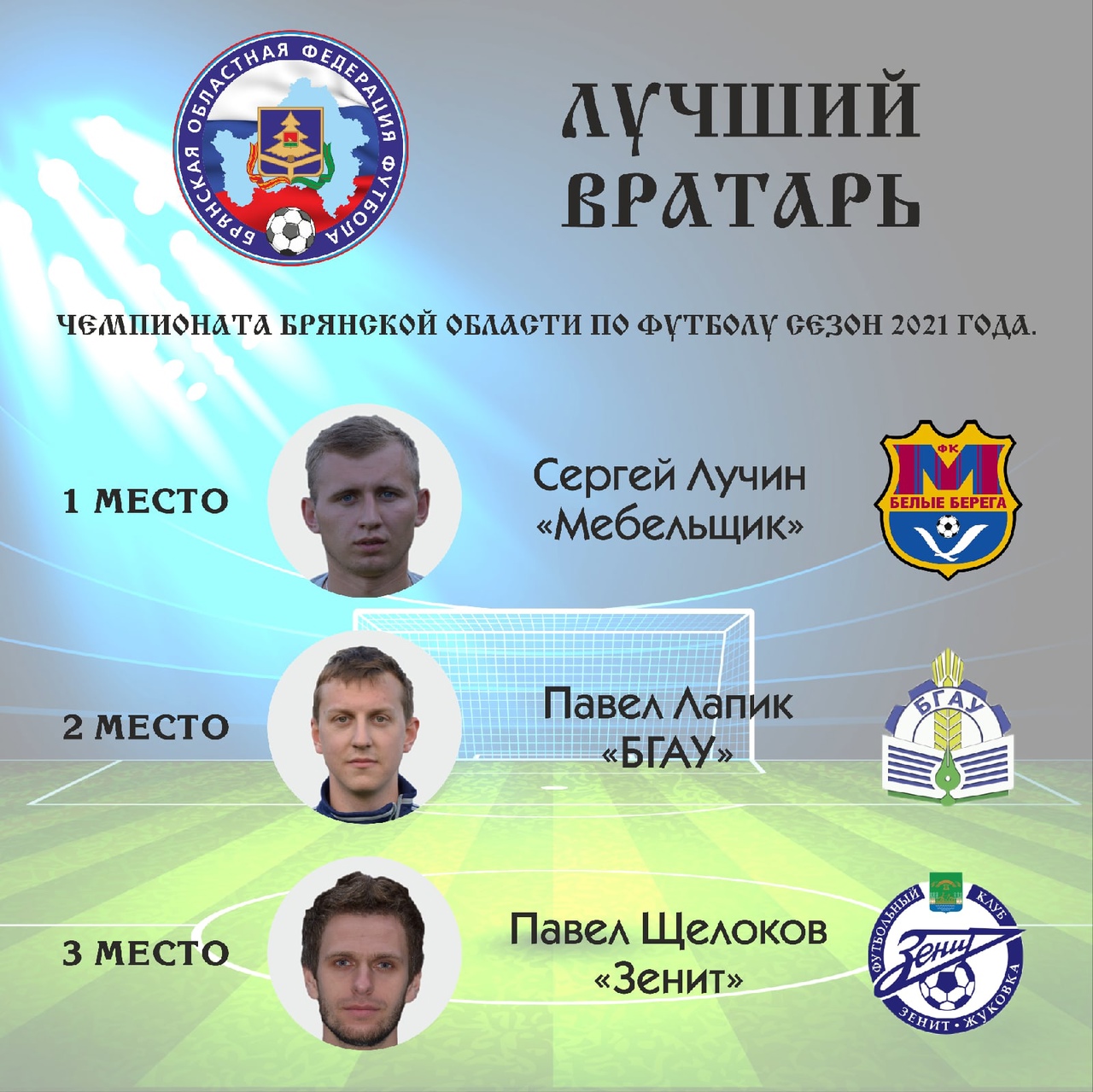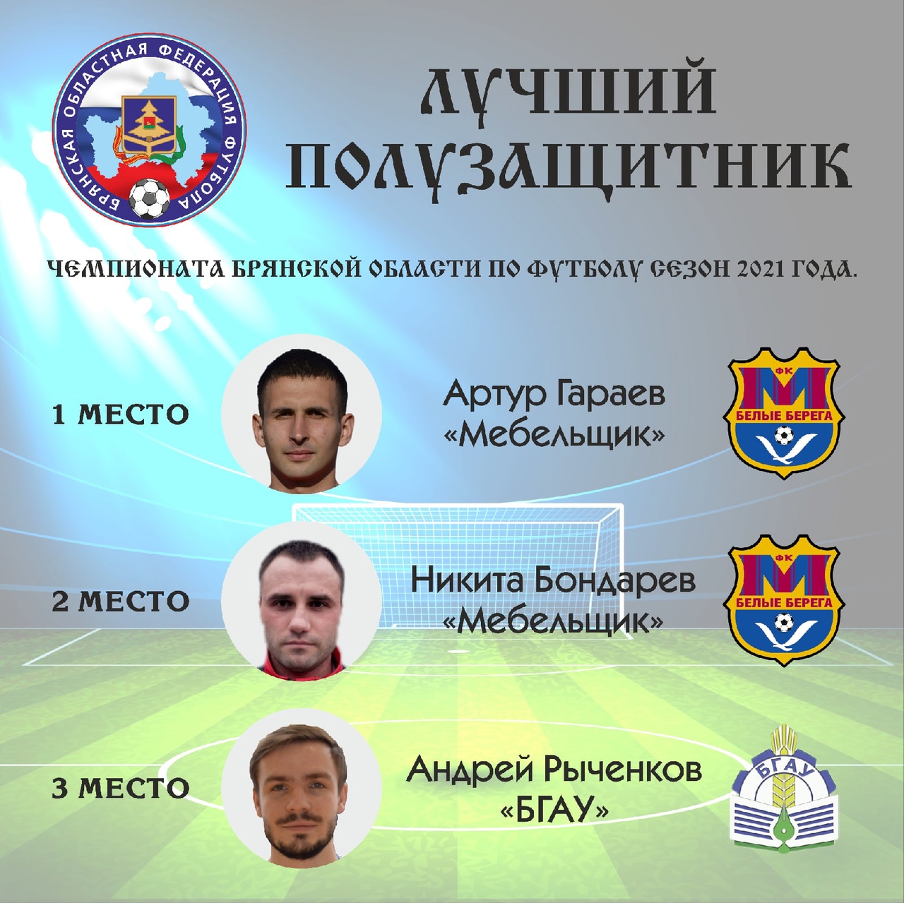 Определены лучшие игроки и тренеры сезона 2021 года в большом футболе. В традиционном опросе приняло участие 50 человек: тренеры, руководители команд, судьи, ветераны футбола. Каждый участник опроса определял тройку лучших в шести номинациях: вратари, защитники, полузащитники, нападающие, тренеры, молодые игроки.