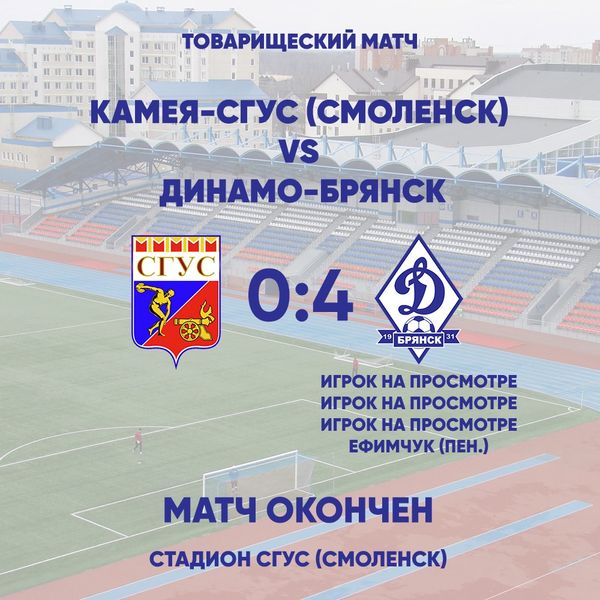 Игра завершилась со счетом 4:0 в пользу «Динамо-Брянск». Тремя забитыми мячами отметились игроки, находящиеся в нашем клубе на просмотре, еще один гол на счету Андрея Ефимчука.
