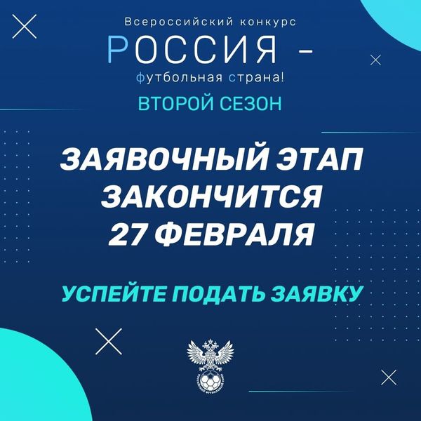 Заявочный этап конкурса «Россия – футбольная страна!» завершится уже в это воскресенье. У вас еще есть возможность успеть прислать свой проект и получить шанс выиграть денежный приз на его развитие. Торопитесь – 27 февраля в 23:59 (мск) Российский футбольный союз остановит прием заявок.