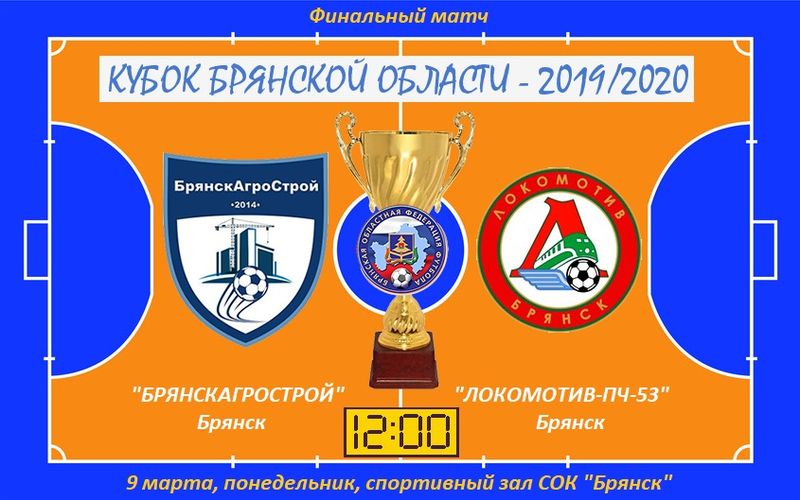 В понедельник, 9 марта, в спортивном зале СОК "Брянск" в 12 часов начнется решающая игра Кубка Брянской области по мини-футболу сезона-2019/2020 г. Действующий обладатель трофея и победитель Чемпионата региона по мини-футболу "БрянскАгроСтрой" попробует оставить почетную награду в своем музее еще на один год в противостоянии с командой "Локомотив-ПЧ-53". Приглашаем любителей мини-футбола посетить заключительный поединок сезона. Вход свободный.